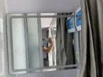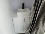 Lavabo avec mitigeur, meuble bas et miroir.